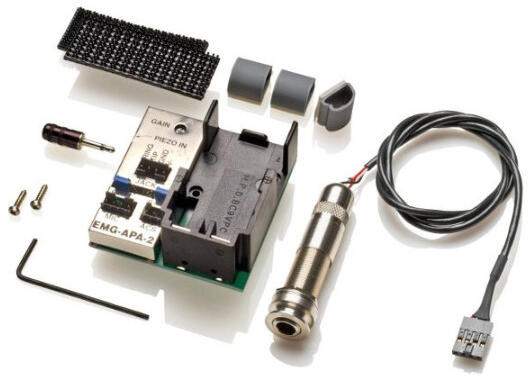 Elemtartóval egybeépített előerősítő, piezo hangszedőkhöz. Kiválóan használható az AT sorozathoz tartozó piezo hangszedőkhöz. Tartozékok: EMG UltraJak kábellel, bemeneti jack, kábeltartók, 1,57mm-es imbuszkulcs, ...