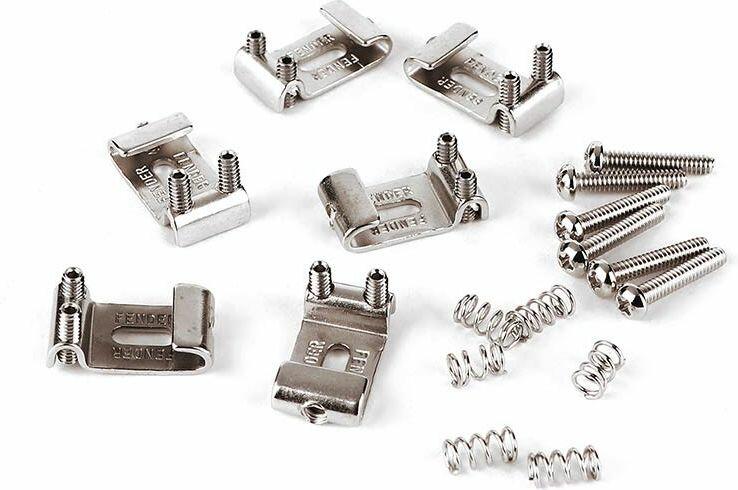 tremolo saddles, American Vintage Strat, chrome, set of 6 Set of six nickel-plated chrome bridge saddles for use on American Vintage series Stratocaster models manufactured from 1986-present. Centered intonation screws, intonation springs and saddle-height adjustment screws included. Features Set of six nickel-plated chrome bridge saddles Centered intonation screws, intonation springs and saddle-h