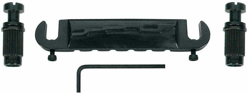 bridge-tailpiece, G-model, with studs, fixed staggered saddles, black specifications bridge diameter anchor: 12mm length anchor: 20mm thread studs: M8 spacing studs: 81mm stringspacing B-e: 50mm radius: 12&;quot; saddles notched: no finish: black