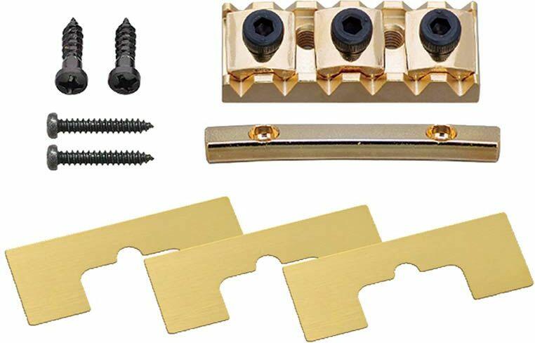 locking nut, 43mm width, 36.5mm string spacing, top mount type, gold Electric guitar locking nut with a 43 mm (1.69 &;quot;) width, 36,5 mm (1,44&;quot;) string spacing and 16; radius. Nut screws mount from front of neck. &;lt;br&;gt;&;lt;br&;gt;Tension bar and mounting screws included. &;lt;br&;gt;&;lt;br&;gt;