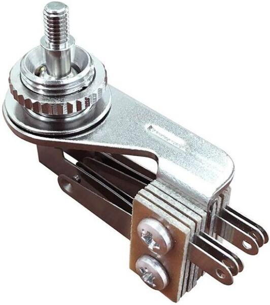 angled toggle switch 3-way, for 3-pickup guitars, made in Japan, nickel contacts, no switch tip This 3-way right angle toggle switch allows for wiring of guitars with three pickups, like for example the SG Custom style guitars. The switch has an extra set of contacts compared to standard three way toggle switches, looking from the bottom (with the contacts on the left and the lever on the right) a