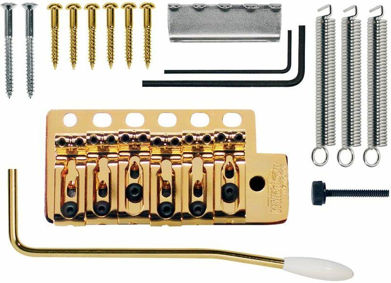tremolo Wilkinson type, pitch 10,8 mm, 6 pivot points, gold Improved Strat tuning stability, sustain and reliability! The baseplate holes are elongated so the screws won&;#039;t bind, for smooth, accurate pitch return. For tuning stability, the string mounting holes are staggered in the steel block for more consistent string angle over the adjustable locking bent-steel saddles. &;lt;br&