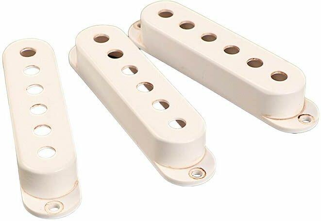 Stallion 50's pickup cover 3/set, white relic Aged pickup covers for ST-style guitar. Round edges with buffed surface and dirt trapped in gaps on the side and screw mounting areas. Aged white. These pickup covers are part of our program of reliced guitar parts, both metal and plastic, to match the look of your reliced or vintage instrument,