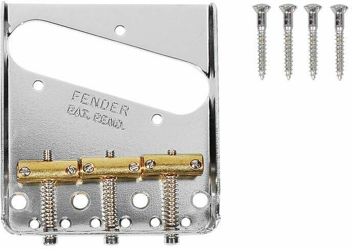 bridge assembly American Vintage Tele, 3 saddle design, chrome Three-saddle chrome bridge assembly for use on vintage-style Telecaster guitars manufactured from 1986-present. Includes string-through-body plate, three vintage-style brass saddles, slot-head saddle-height screws, intonation screws and springs, and four vintage-style slot-head bridge-mounting screws. Features Three-saddle chrome bridg