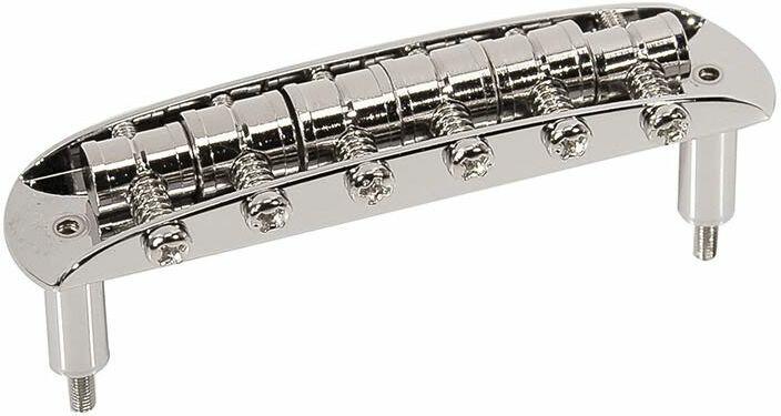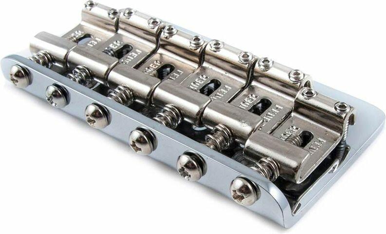 bridge assembly Mustang Guitar, chrome Complete chrome-plated bridge assembly for use on Classic series ’65 Mustang and Jag-Stang®; guitar models manufactured from 2006-present. Note that this assembly does not include the ";thimble"; posts that fit into the guitar body. Features Complete chrome-plated bridge assembly Six vintage-style single-groove ";barrel"; saddles Six intonation screws and