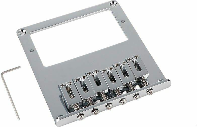 bridge-tailpiece, Teaser, block saddles, flat plate /for humbucker, chrome Dimensions: - Bridge plate: 101mm (l) x 89mm (w) - Distance body mounting screws (heart to heart): 80mm (w) x 90mm (l) - String spacing: 54mm