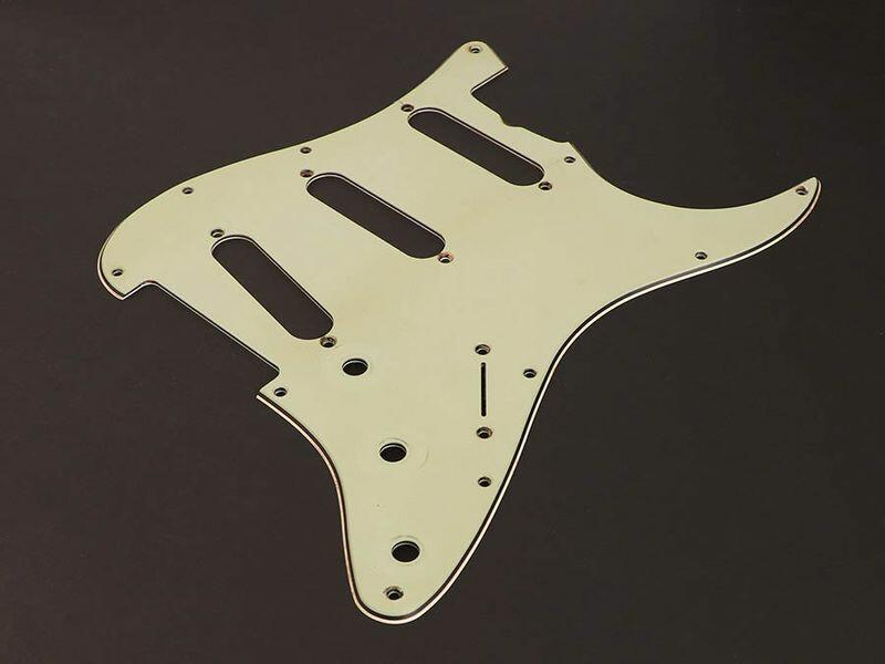 pickguard Stallion SSS, 3 ply mint ivory relic Worn truss rod scope, superficial crack lines, discolored surface buffed to aged look with dirt buildup on screw holes. Worn marks under the string areas with slightly rounded edges. 11 screw holes. Screws not included. MRC-STSCW is the matching aged set of screws. This pickguard is part of our program of reliced guitar parts, both metal and plastic,