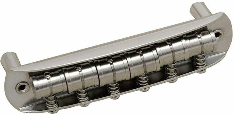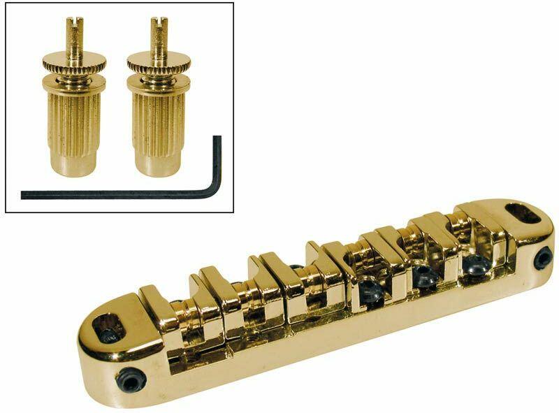 bridge for e-guitar roller bridge model, with studs, 14&;quot; radius, stringspacing 50,4mm, gold The roller parts will help keep your guitar in tune better when bending strings or using a vibrato system. The bridge can be locked to the posts for improved sustain. specifications bridge diameter anchor: 12mm length anchor: 19,5mm thread studs: M8 diameter studhole in bridge: 8x4mm spacing studs