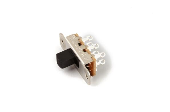 Fender Jaguar/Jazzmaster Slide Switch, DPDT kapcsoló, fekete A Fender kiváló minõségű kapcsolókat kínál minden igényedre, legyen szó akár egy elhasználódott kapcsoló cseréjérõl, akár csak kedvenc hangszered hangzásbeli változatosságának növelésérõl. JELLEMZÕK Fekete cserekapcsoló csúszókapcsoló Kétpólusú/k ettõs dobás kialakítás Hat forrasztott fül Nem tarta