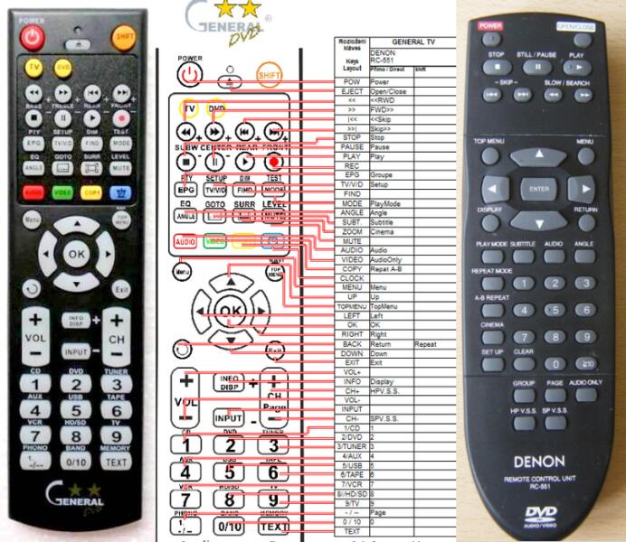 Helyettesítő távirányító DENON RC-551 (RC551) - 100%-os 1:1 arányú helyettesítője az eredeti távirányítónak. A távirányító a DENON:AV-0868, DVD-1600P, DVD1600. (Előfordulhat, hogy nem minden kompatibilis modell szerepel a listában. Ha nem biztos benne, csak adja meg a készülékmodelljét (online chat-en vagy e-mailben), és mi azonnal ellenőrizzük, if kompatibilis-e az Ön