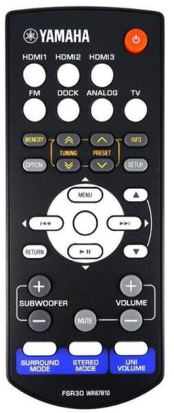 Az eredeti 1:1 arányú duplikátuma távirányító YAMAHA WR87810. A távirányító a YAMAHA:SR-300, SR300, YHT-S400, YHTS400 . (Előfordulhat, hogy nem minden kompatibilis modell szerepel a listában. Ha nem biztos benne, csak adja meg a készülékmodelljét (online chat-en vagy e-mailben), és mi azonnal ellenőrizzük, if kompatibilis-e az Ön készülékével. Az ellenőrzött kompatibilit