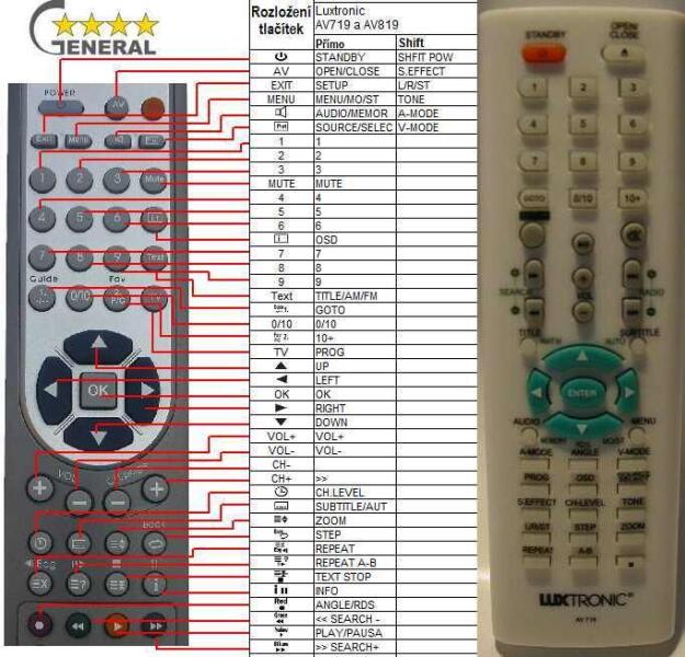 Helyettesítő távirányító LUXTRONIC AV719, AV819 - 100%-os 1:1 arányú helyettesítője az eredeti távirányítónak. A távirányító a LUXTRONIC:AV 719, AV 819, AV-719, AV-819, AV719, AV819. (Előfordulhat, hogy nem minden kompatibilis modell szerepel a listában. Ha nem biztos benne, csak adja meg a készülékmodelljét (online chat-en vagy e-mailben), és mi azonnal ellenőrizzük, if