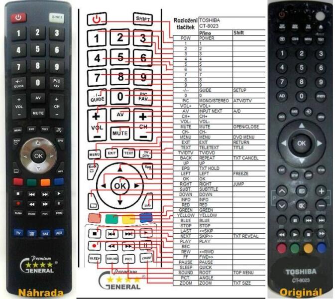 Helyettesítő távirányító TOSHIBA CT-8023 (CT8023) - 100%-os 1:1 arányú helyettesítője az eredeti távirányítónak. A távirányító a TOSHIBA:19DL833G, 22DL833G, 23DL933, 23DL933G, 23DL934G, 26DL833F, 26DL833G, 26DL933, 26DL934G, 32DL833N, 32DL933, 40L3443DG, 40L3451DB, 40L3451DN, 40L3453D. (Előfordulhat, hogy nem minden kompatibilis modell szerepel a listában. Ha nem biztos benne,