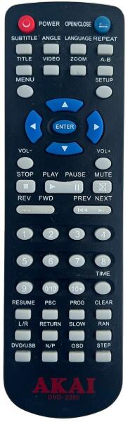 Helyettesítő távirányító AKAI DVD-2280 (DVD2280) - 100%-os 1:1 arányú helyettesítője az eredeti távirányítónak. A távirányító a AKAI:DVD-2280, DVD2280. (Előfordulhat, hogy nem minden kompatibilis modell szerepel a listában. Ha nem biztos benne, csak adja meg a készülékmodelljét (online chat-en vagy e-mailben), és mi azonnal ellenőrizzük, if kompatibilis-e az Ön készül