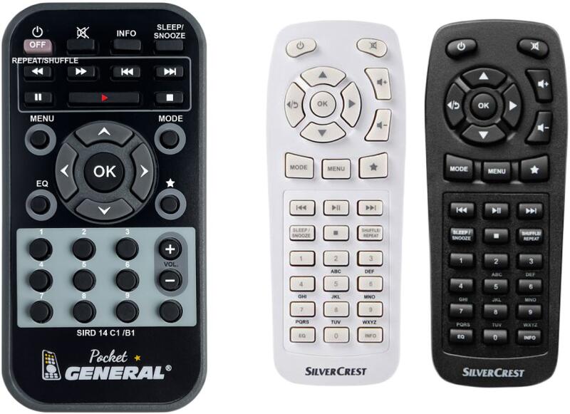 Az eredeti 1:1 arányú duplikátuma távirányító SILVERCREST SIRD 14 C1, SIRD 14 B1. A távirányító a SILVERCREST:SIRD14B1, SIRD14C1. (Előfordulhat, hogy nem minden kompatibilis modell szerepel a listában. Ha nem biztos benne, csak adja meg a készülékmodelljét (online chat-en vagy e-mailben), és mi azonnal ellenőrizzük, if kompatibilis-e az Ön készülékével. Az ellenőrzött ko