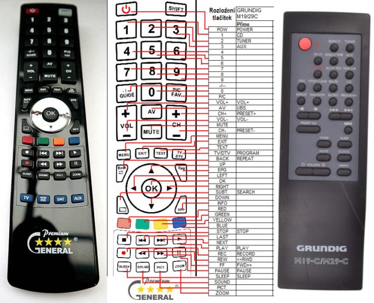 Helyettesítő távirányító GRUNDIG M-19C, M-29C (M19C, M29C) - 100%-os 1:1 arányú helyettesítője az eredeti távirányítónak. A távirányító a GRUNDIG:M-19C, M-29C, M19C, M29C. (Előfordulhat, hogy nem minden kompatibilis modell szerepel a listában. Ha nem biztos benne, csak adja meg a készülékmodelljét (online chat-en vagy e-mailben), és mi azonnal ellenőrizzük, if kompatibil