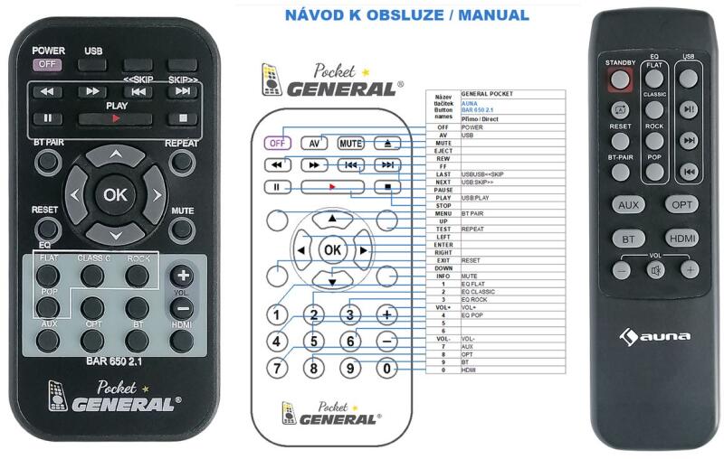 Az eredeti 1:1 arányú duplikátuma távirányító AUNA Areal Bar 650 2.1. A távirányító a AUNA:AREAL BAR 650 2.1. (Előfordulhat, hogy nem minden kompatibilis modell szerepel a listában. Ha nem biztos benne, csak adja meg a készülékmodelljét (online chat-en vagy e-mailben), és mi azonnal ellenőrizzük, if kompatibilis-e az Ön készülékével. Az ellenőrzött kompatibilitást mi ga