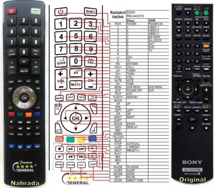 Helyettesítő távirányító SONY RM-AAU104, RM-AAU105 (RMAAU104, RMAAU105) - 100%-os 1:1 arányú helyettesítője az eredeti távirányítónak. A távirányító a SONY:STR-DH520. (Előfordulhat, hogy nem minden kompatibilis modell szerepel a listában. Ha nem biztos benne, csak adja meg a készülékmodelljét (online chat-en vagy e-mailben), és mi azonnal ellenőrizzük, if kompatibilis-e