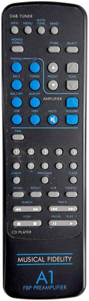Helyettesítő távirányító Musical Fidelity A1 FBP, KW250S - 100%-os 1:1 arányú helyettesítője az eredeti távirányítónak. A távirányító a Musical Fidelity:A1 FBP, A1FBP, KW250S, KW550 . (Előfordulhat, hogy nem minden kompatibilis modell szerepel a listában. Ha nem biztos benne, csak adja meg a készülékmodelljét (online chat-en vagy e-mailben), és mi azonnal ellenőrizzük, i