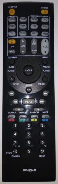 Helyettesítő távirányító ONKYO RC-834M (RC834M) - 100%-os 1:1 arányú helyettesítője az eredeti távirányítónak. A távirányító a ONKYO:HT-R758, HT-R791, HT-RC440, HT-S6500, HT-S7500 TX, HT-S7500TX, HTR758, HTR791, HTRC440, HTS6500, HTS7500 TX, HTS7500TX, TX-NR414, TX-NR515, TXNR414, TXNR515. (Előfordulhat, hogy nem minden kompatibilis modell szerepel a listában. Ha nem biztos ben
