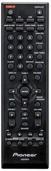 Az eredeti 1:1 arányú duplikátuma távirányító PIONEER AXD7670, AXD7675, AXD7678. A távirányító a PIONEER:AXD7670, X-CM31, X-CM31-K, X-CM31-R, X-CM31-T, X-CM31-W. (Előfordulhat, hogy nem minden kompatibilis modell szerepel a listában. Ha nem biztos benne, csak adja meg a készülékmodelljét (online chat-en vagy e-mailben), és mi azonnal ellenőrizzük, if kompatibilis-e az Ön kész