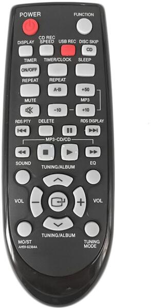 Helyettesítő távirányító SAMSUNG AH59-02364A (AH5902364A) - 100%-os 1:1 arányú helyettesítője az eredeti távirányítónak. A távirányító a SAMSUNG:MM-D320, MM-D330, MX-D630. (Előfordulhat, hogy nem minden kompatibilis modell szerepel a listában. Ha nem biztos benne, csak adja meg a készülékmodelljét (online chat-en vagy e-mailben), és mi azonnal ellenőrizzük, if kompatibil