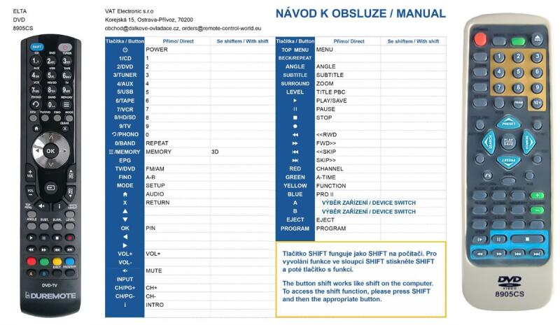 Helyettesítő távirányító ELTA 8905CS, 8883CS, 8909CS, 8892DVDP - 100%-os 1:1 arányú helyettesítője az eredeti távirányítónak. A távirányító a ELTA:8883 CS, 8883CS, 8892 DVDP, 8892DVDP, 8905 CS, 8905CS, 8909 CS, 8909CS. (Előfordulhat, hogy nem minden kompatibilis modell szerepel a listában. Ha nem biztos benne, csak adja meg a készülékmodelljét (online chat-en vagy e-mailben
