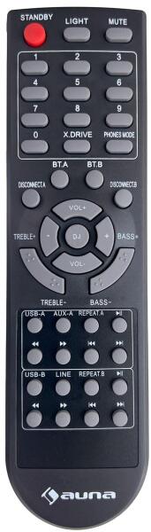 Helyettesítő távirányító AUNA Clubmaster 8000 - 100%-os 1:1 arányú helyettesítője az eredeti távirányítónak. A távirányító a AUNA:10032821, CLUBMASTER 8000. (Előfordulhat, hogy nem minden kompatibilis modell szerepel a listában. Ha nem biztos benne, csak adja meg a készülékmodelljét (online chat-en vagy e-mailben), és mi azonnal ellenőrizzük, if kompatibilis-e az Ön ké