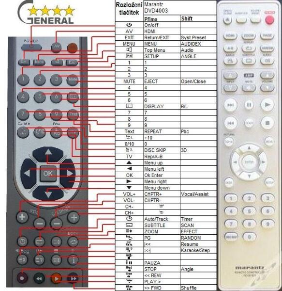 Helyettesítő távirányító MARANTZ DV4003 - 100%-os 1:1 arányú helyettesítője az eredeti távirányítónak. A távirányító a MARANTZ:DV4003. (Előfordulhat, hogy nem minden kompatibilis modell szerepel a listában. Ha nem biztos benne, csak adja meg a készülékmodelljét (online chat-en vagy e-mailben), és mi azonnal ellenőrizzük, if kompatibilis-e az Ön készülékével. Az elle
