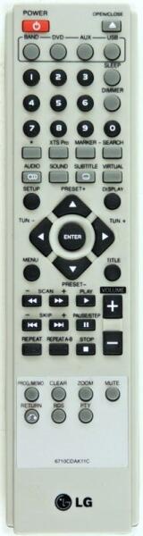 Az eredeti 1:1 arányú duplikátuma távirányító LG 6710CDAK11C. A távirányító a LG:LH-T360SE, LH-T363, LH-T363SE, LHT360, LTH363. (Előfordulhat, hogy nem minden kompatibilis modell szerepel a listában. Ha nem biztos benne, csak adja meg a készülékmodelljét (online chat-en vagy e-mailben), és mi azonnal ellenőrizzük, if kompatibilis-e az Ön készülékével. Az ellenőrzött komp