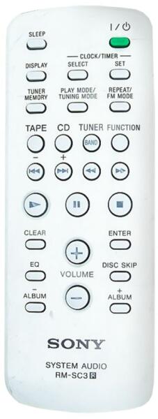 Az eredeti 1:1 arányú duplikátuma távirányító SONY RM-SC3, RM-SC30, RM-SC31, RM-SC50 (RMSC3, RMSC30, RMSC31, RMSC50). A távirányító a SONY:450, 555, 750, 9000, CMT-BX5BT, CMT-CPX11, CMT-CPX22, CMT-CPZ1, CMT-CPZ2, CMT-CPZ3, CMT-EH10, CMT-EH12, CMT-EH15, CMT-GPX5, CMT-GPX6, CMT-GPX7, CMT-HPX10W, CMT-HPX9, CMT-HPZ7, CMT-HX30, CMT-NE3, CMT-NEZ3, CMT-NEZ30, CMT-NEZ5, CMT-SPZ50, CMT-SPZ70, CM