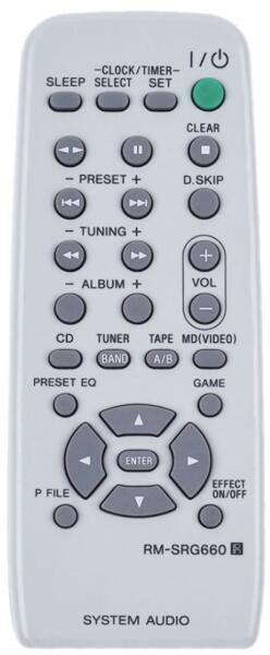 Helyettesítő távirányító SONY RM-SRG660 (RMSRG660) - 100%-os 1:1 arányú helyettesítője az eredeti távirányítónak. A távirányító a SONY:MHC-RG330, MHC-RG440S. (Előfordulhat, hogy nem minden kompatibilis modell szerepel a listában. Ha nem biztos benne, csak adja meg a készülékmodelljét (online chat-en vagy e-mailben), és mi azonnal ellenőrizzük, if kompatibilis-e az Ön k
