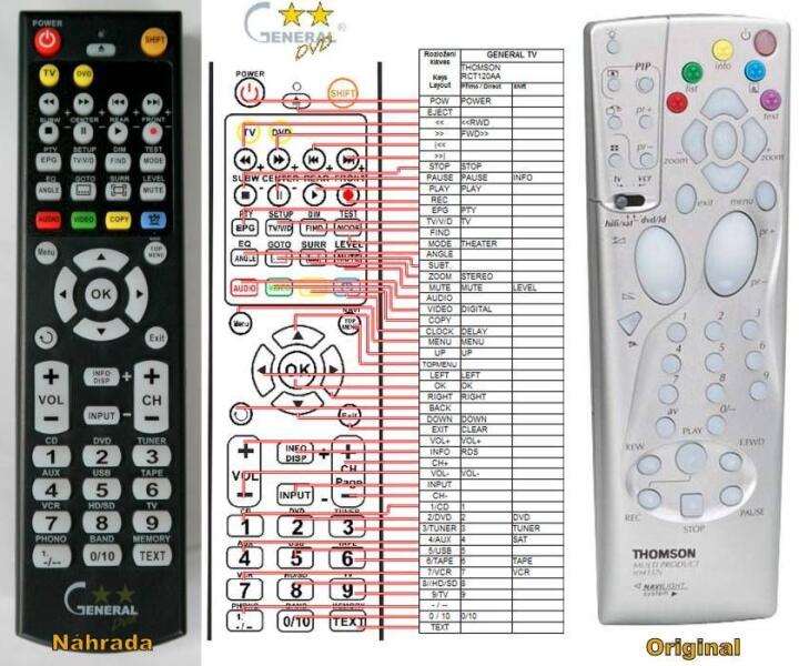 Helyettesítő távirányító THOMSON RCT120AA M1 - 100%-os 1:1 arányú helyettesítője az eredeti távirányítónak. A távirányító a THOMSON:DPL950VD. (Előfordulhat, hogy nem minden kompatibilis modell szerepel a listában. Ha nem biztos benne, csak adja meg a készülékmodelljét (online chat-en vagy e-mailben), és mi azonnal ellenőrizzük, if kompatibilis-e az Ön készülékével.