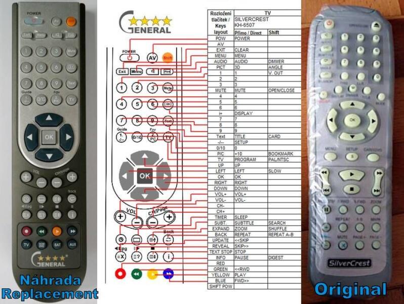 Helyettesítő távirányító SILVERCREST KH-6508, KH-6509 (KH6508, KH6509) - 100%-os 1:1 arányú helyettesítője az eredeti távirányítónak. A távirányító a SILVERCREST:KH-6508, KH-6509, KH6508, KH6509. (Előfordulhat, hogy nem minden kompatibilis modell szerepel a listában. Ha nem biztos benne, csak adja meg a készülékmodelljét (online chat-en vagy e-mailben), és mi azonnal ellen