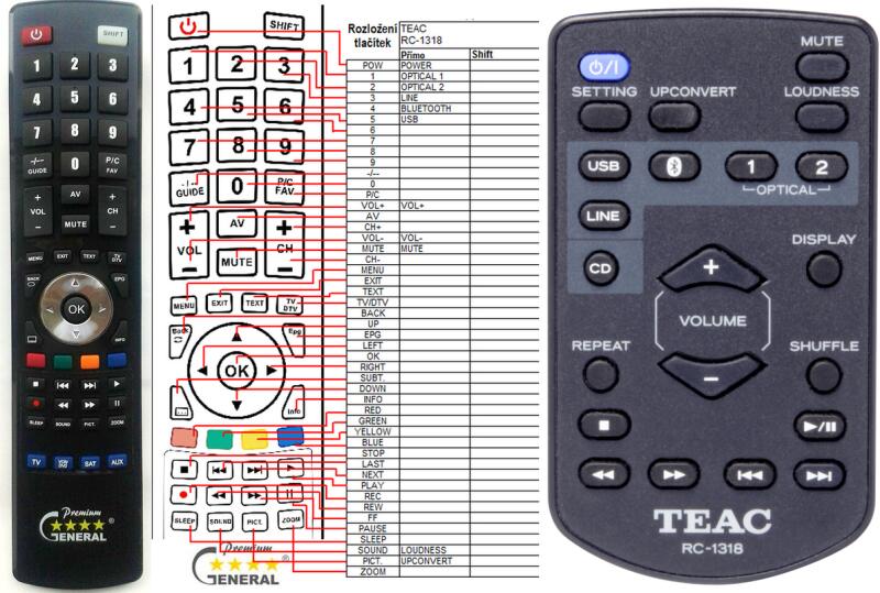 Helyettesítő távirányító TEAC RC-1318 (RC1318) - 100%-os 1:1 arányú helyettesítője az eredeti távirányítónak. A távirányító a TEAC:AI-101DA. (Előfordulhat, hogy nem minden kompatibilis modell szerepel a listában. Ha nem biztos benne, csak adja meg a készülékmodelljét (online chat-en vagy e-mailben), és mi azonnal ellenőrizzük, if kompatibilis-e az Ön készülékével. A
