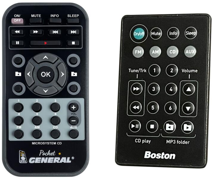 Az eredeti 1:1 arányú duplikátuma távirányító BOSTON MicroSystem CD. A távirányító General POCKET duplicate pontosan ugyanazokkal a funkciókkal és gombnevekkel rendelkezik mint az eredeti távirányító. Nincs szükség beállításra és nincs szükség kódokra, csak helyezze bele az elemeket, és máris használható a fent felsorolt modellekkel. A távirányító ebben a regisztr
