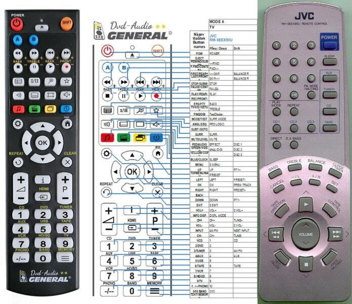 Helyettesítő távirányító JVC RM-SEEX90U (RMSEEX90U) - 100%-os 1:1 arányú helyettesítője az eredeti távirányítónak. A távirányító a JVC:RX-EX70R, RXEX70R. (Előfordulhat, hogy nem minden kompatibilis modell szerepel a listában. Ha nem biztos benne, csak adja meg a készülékmodelljét (online chat-en vagy e-mailben), és mi azonnal ellenőrizzük, if kompatibilis-e az Ön kész