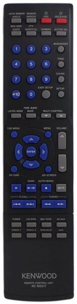Helyettesítő távirányító KENWOOD RC-R0517, RC-R0518, A70175208 (RCR0517, RCR0518, A70175208) - 100%-os 1:1 arányú helyettesítője az eredeti távirányítónak. A távirányító a KENWOOD:KRF-V5100D, KRF-V5200D, KRF-V5300D, KRF-V5450D, KRF-V6100D, KRF-V6300D, KRF-V6400D, KRF-V7200D, KRF-X9060D, KRFX9060D. (Előfordulhat, hogy nem minden kompatibilis modell szerepel a listában. Ha nem bi