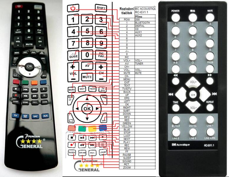 Helyettesítő távirányító BC ACOUSTIQUE EX-222.1 (EX222.1) - 100%-os 1:1 arányú helyettesítője az eredeti távirányítónak. A távirányító a BC ACOUSTIQUE:ACOUSTIQUE EX-222.1, ACOUSTIQUE EX222.1. (Előfordulhat, hogy nem minden kompatibilis modell szerepel a listában. Ha nem biztos benne, csak adja meg a készülékmodelljét (online chat-en vagy e-mailben), és mi azonnal ellenőri