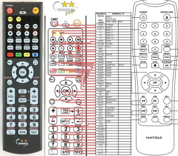Helyettesítő távirányító MATSUI M1DVD12E - 100%-os 1:1 arányú helyettesítője az eredeti távirányítónak. A távirányító a MATSUI:M1DVD12E. (Előfordulhat, hogy nem minden kompatibilis modell szerepel a listában. Ha nem biztos benne, csak adja meg a készülékmodelljét (online chat-en vagy e-mailben), és mi azonnal ellenőrizzük, if kompatibilis-e az Ön készülékével. Az el