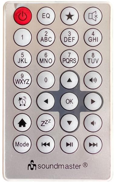 Helyettesítő távirányító Soundmaster IR1450W - 100%-os 1:1 arányú helyettesítője az eredeti távirányítónak. A távirányító a Soundmaster:IR1450W. (Előfordulhat, hogy nem minden kompatibilis modell szerepel a listában. Ha nem biztos benne, csak adja meg a készülékmodelljét (online chat-en vagy e-mailben), és mi azonnal ellenőrizzük, if kompatibilis-e az Ön készülékéve