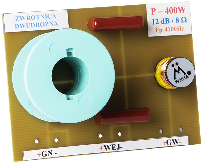 Kétsávos hangsugárzó-átalakító 8 Ohm impedanciával - Maximális teljesítmény: 400 W- Frekvenciaosztási pont: Fp 4100 Hz- Meredekség: 12 dB.