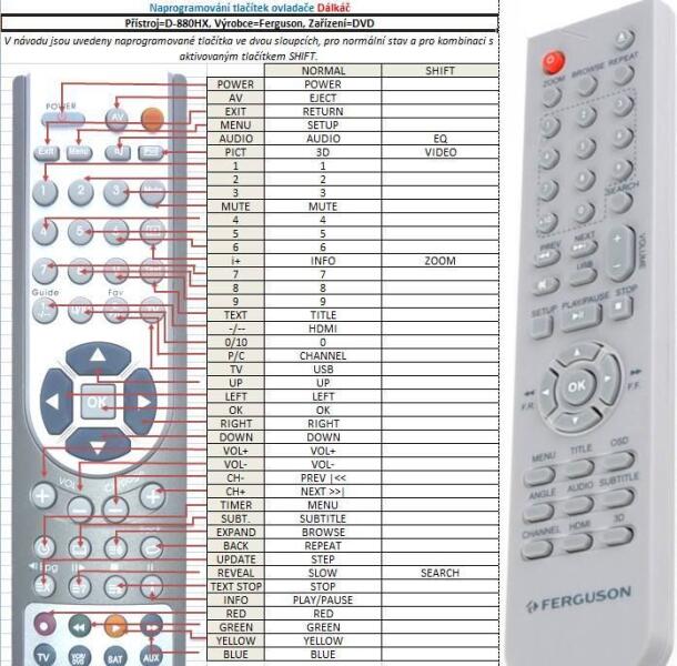 Helyettesítő távirányító FERGUSON D-880HX (D880HX) - 100%-os 1:1 arányú helyettesítője az eredeti távirányítónak. A távirányító a FERGUSON:D-800 HX, D880HX. (Előfordulhat, hogy nem minden kompatibilis modell szerepel a listában. Ha nem biztos benne, csak adja meg a készülékmodelljét (online chat-en vagy e-mailben), és mi azonnal ellenőrizzük, if kompatibilis-e az Ön ké