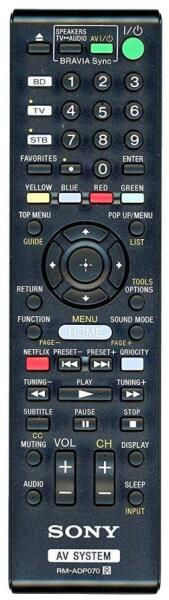 Helyettesítő távirányító SONY RM-ADP070 (RMADP070) - 100%-os 1:1 arányú helyettesítője az eredeti távirányítónak. A távirányító a SONY:BDV-E780W, BDV-E980W, BDVE780W, BDVE980W, HBD-E280, HBD-E580, HBDE280, HBDE580. (Előfordulhat, hogy nem minden kompatibilis modell szerepel a listában. Ha nem biztos benne, csak adja meg a készülékmodelljét (online chat-en vagy e-mailben),