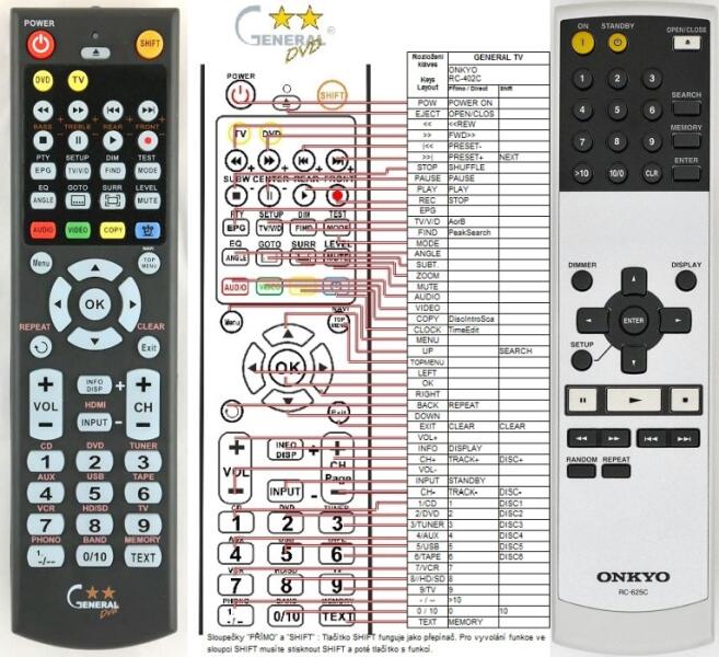 Helyettesítő távirányító ONKYO RC-625C (RC625C) - 100%-os 1:1 arányú helyettesítője az eredeti távirányítónak. A távirányító a ONKYO:DX-7555, DX7555. (Előfordulhat, hogy nem minden kompatibilis modell szerepel a listában. Ha nem biztos benne, csak adja meg a készülékmodelljét (online chat-en vagy e-mailben), és mi azonnal ellenőrizzük, if kompatibilis-e az Ön készülé