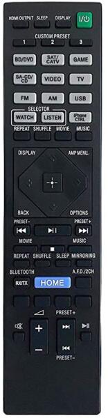 Helyettesítő távirányító SONY RMT-AA320U (RMTAA320U) - 100%-os 1:1 arányú helyettesítője az eredeti távirányítónak. A távirányító a SONY:STR-DN1080, STRDN1080. (Előfordulhat, hogy nem minden kompatibilis modell szerepel a listában. Ha nem biztos benne, csak adja meg a készülékmodelljét (online chat-en vagy e-mailben), és mi azonnal ellenőrizzük, if kompatibilis-e az Ön