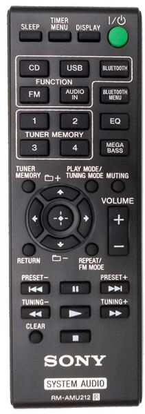Helyettesítő távirányító SONY RM-AMU212 (RMAMU212) - 100%-os 1:1 arányú helyettesítője az eredeti távirányítónak. A távirányító a SONY:CMT-SBT20, CMT-SBT20B, CMT-X3CD, CMTSBT20B, HCD-SBT20, HCDSBT20. (Előfordulhat, hogy nem minden kompatibilis modell szerepel a listában. Ha nem biztos benne, csak adja meg a készülékmodelljét (online chat-en vagy e-mailben), és mi azonnal e