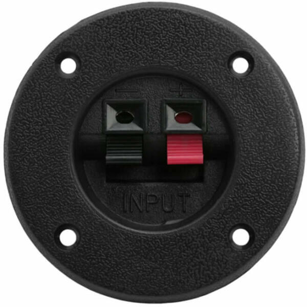 Műszaki adatok: - Csíptetős csatlakozás - Műanyag ház - Csavarral rögzíthető - Külső átmérő: 6,5 cm - Beépítési átmérő: 4,7 cm Termékleírás: Jó minőségű, hangfalba építhető csatlakozó. Kábel rögzítése egyszerűen csíptetve történik. Beépítése rendkívül egyszerű, 4 darab csavarral rögzíthető.