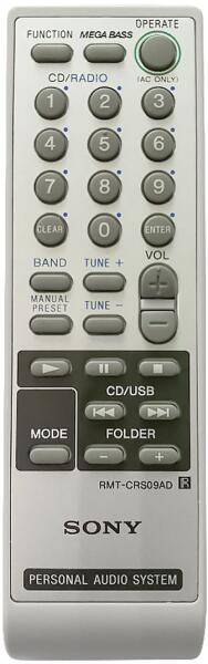 Helyettesítő távirányító SONY RMT-CRS09AD (RMTCRS09AD) - 100%-os 1:1 arányú helyettesítője az eredeti távirányítónak. A távirányító a SONY:ZS-RS09CP, ZSRS09CP. (Előfordulhat, hogy nem minden kompatibilis modell szerepel a listában. Ha nem biztos benne, csak adja meg a készülékmodelljét (online chat-en vagy e-mailben), és mi azonnal ellenőrizzük, if kompatibilis-e az Ön