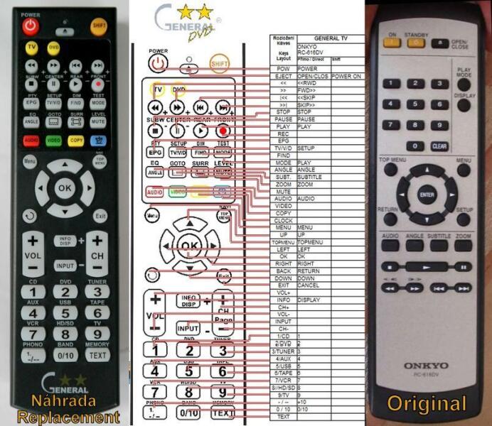 Helyettesítő távirányító ONKYO RC-616DV (RC616DV) - 100%-os 1:1 arányú helyettesítője az eredeti távirányítónak. A távirányító a ONKYO:DV-SP303E, DV-SP403E, DV-SP404E. (Előfordulhat, hogy nem minden kompatibilis modell szerepel a listában. Ha nem biztos benne, csak adja meg a készülékmodelljét (online chat-en vagy e-mailben), és mi azonnal ellenőrizzük, if kompatibilis-e